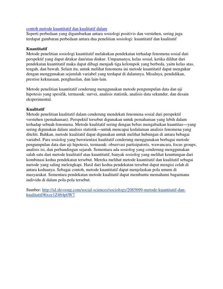Dalam penelitian kualitatif ini melakukan kajian yang holistik menyeluruh sehingga dalam metode penelitian kualitatif cenderung penelitian dilakukan dalam kurun waktu yang panjang. Macam-Macam Metode yang digunakan dalam Sosiologi antara lain. Kamu Penelitian kualitatif dan kuantitatif sosiologi foto yang siap. Penelitian kualitatif dan kuantitatif sosiologi adalah topik yang sedang diburu untuk dan disukai oleh netizen saat ini. Kamu dapat Unduh atau bookmark Penelitian kualitatif dan kuantitatif sosiologi file di sini.